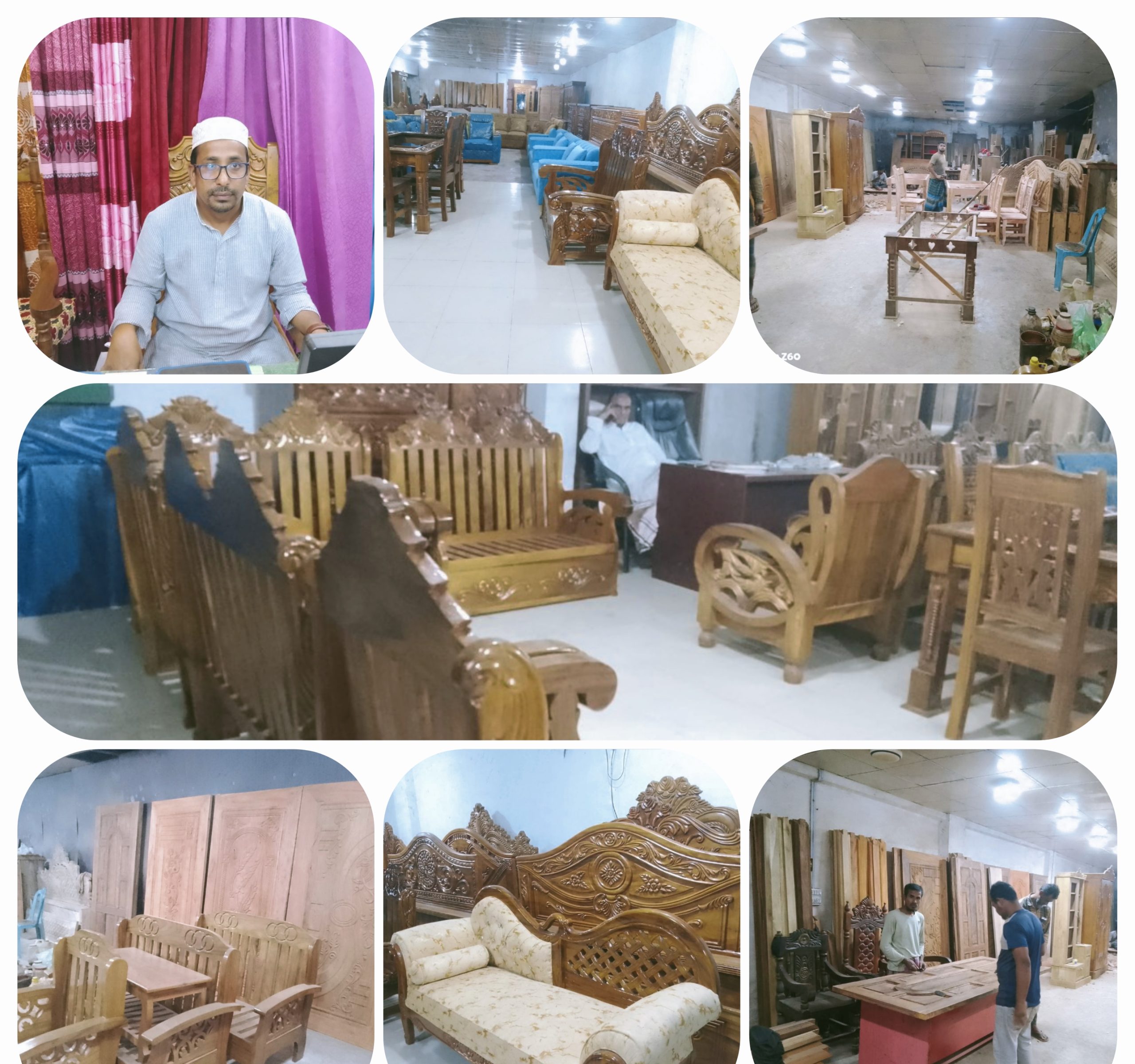 সেগুন, গামরী, মেহগুনি, রেন্ডি ও কড়াই কাঠ, সাইজ কাঠ দ্বারা ফার্ণিচারের কাজ করা হয় অত্যাধুনিক মেশিন দ্বারা খাট, ড্রেসিং টেবিল, আলমারি, দরজা, জানালা, চেয়ার, টেবিল, কেবিনেট ফাইল তৈরী ও অত্যাধুনিক CNC ডিজাইন মেশিন দ্বারা নকশার কাজ করা হয় এবং নিজস্ব স-মিলে সকল প্রকার কাঠ চেরাই করা হয়।