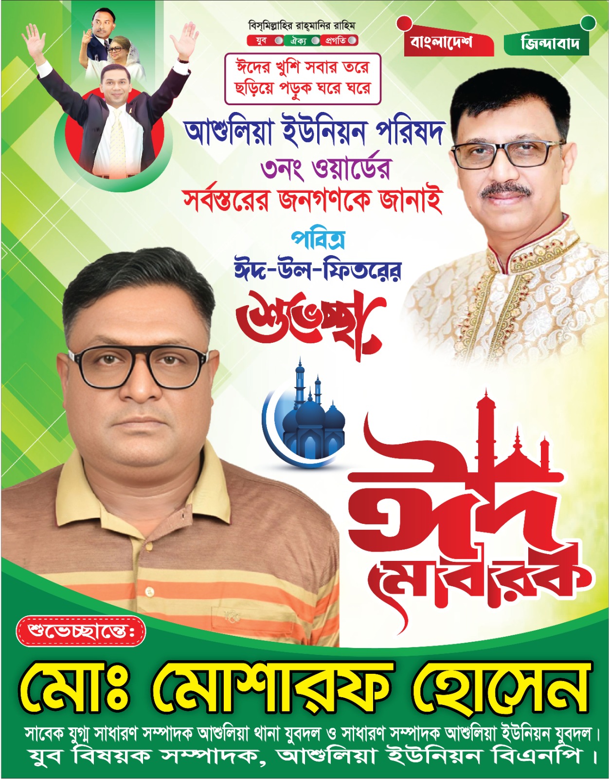 পবিত্র ঈদুল ফিতর উপলক্ষে আশুলিয়া ৩ নং ওয়ার্ডের মেম্বার পদপ্রার্থী, সাবেক যুগ্ম সাধারণ সম্পাদক আশুলিয়া থানা যুবদল, সাধারণ সম্পাদক আশুলিয়া ইউনিয়ন যুবদল এবং যুব বিষয়ক সম্পাদক আশুলিয়া ইউনিয়ন বিএনপি—জনাব মোঃ মোশারফ হোসেন এলাকাবাসীসহ দেশবাসীকে আন্তরিক শুভেচ্ছা ও ঈদ মোবারক জানিয়েছেন।